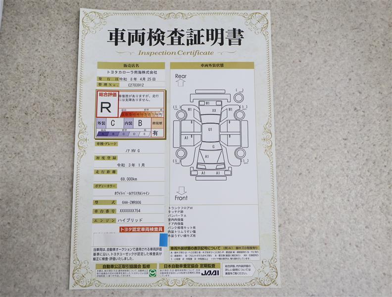 上記と同様の評価点・状態表を「車両検査証明書」として店舗の展示車両に搭載しております。