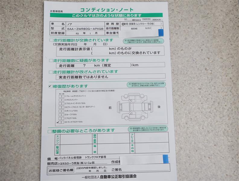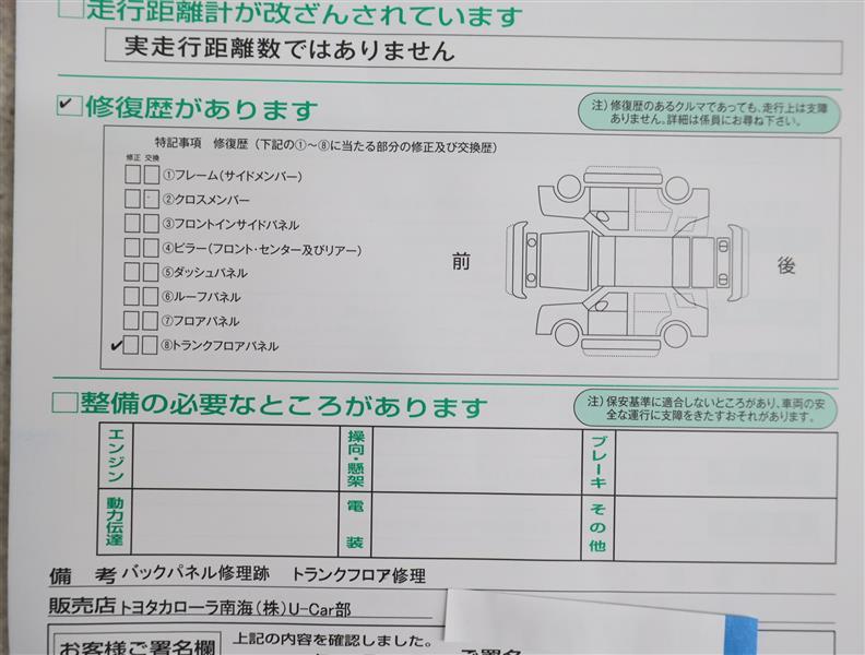 「修復歴あり」の場合、修復部位の詳細につきましては、販売店へお問合せください。