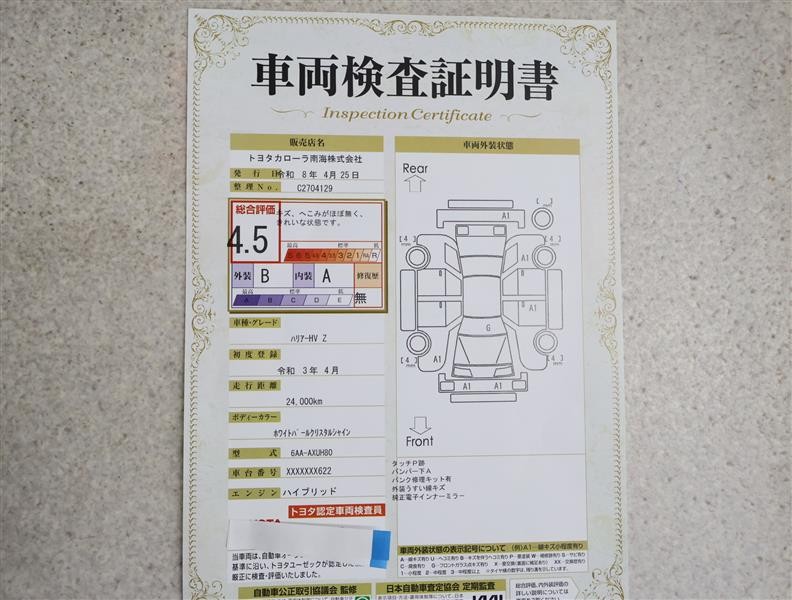 上記と同様の評価点・状態表を「車両検査証明書」として店舗の展示車両に搭載しております。