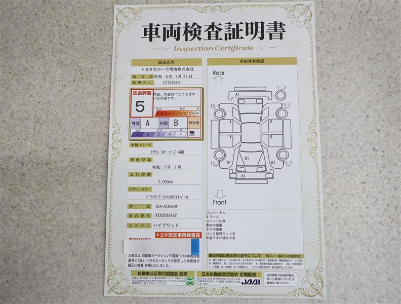 上記と同様の評価点・状態表を「車両検査証明書」として店舗の展示車両に搭載しております。