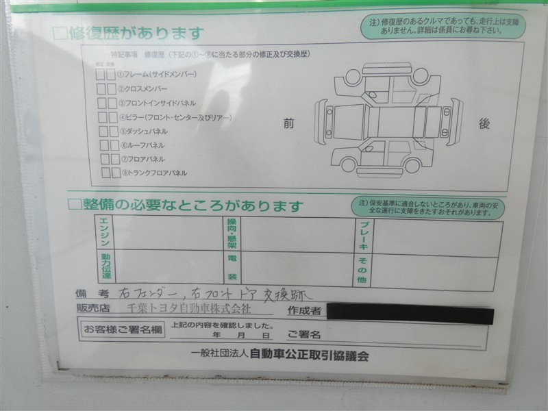 上記と同様の評価点・状態表を「車両検査証明書」として店舗の展示車両に搭載しております。