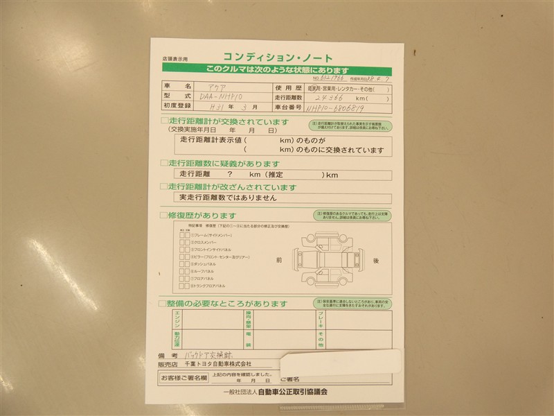 上記と同様の評価点・状態表を「車両検査証明書」として店舗の展示車両に搭載しております。