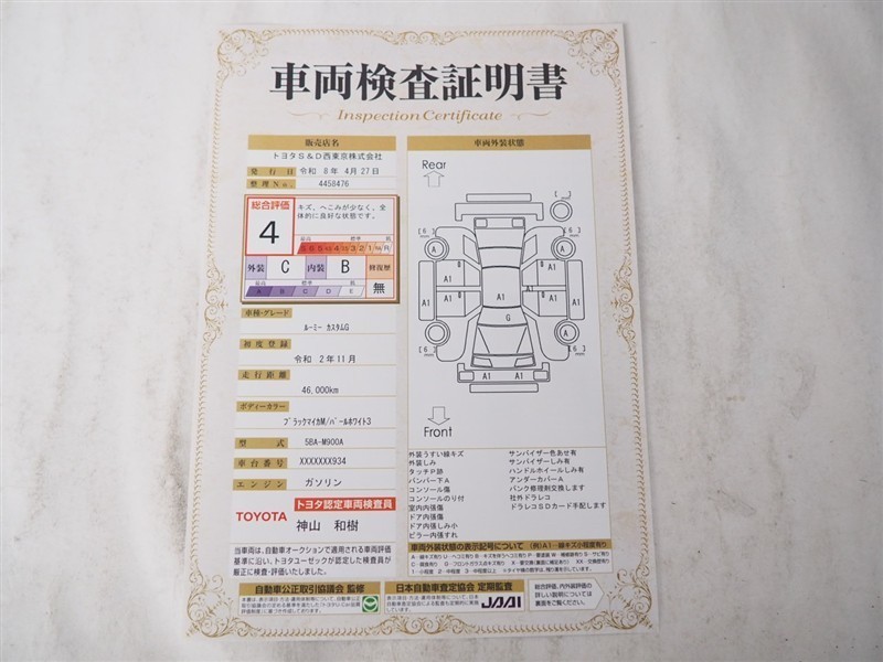 上記と同様の評価点・状態表を「車両検査証明書」として店舗の展示車両に搭載しております。