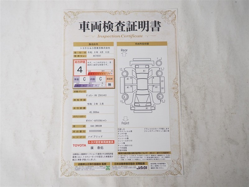上記と同様の評価点・状態表を「車両検査証明書」として店舗の展示車両に搭載しております。