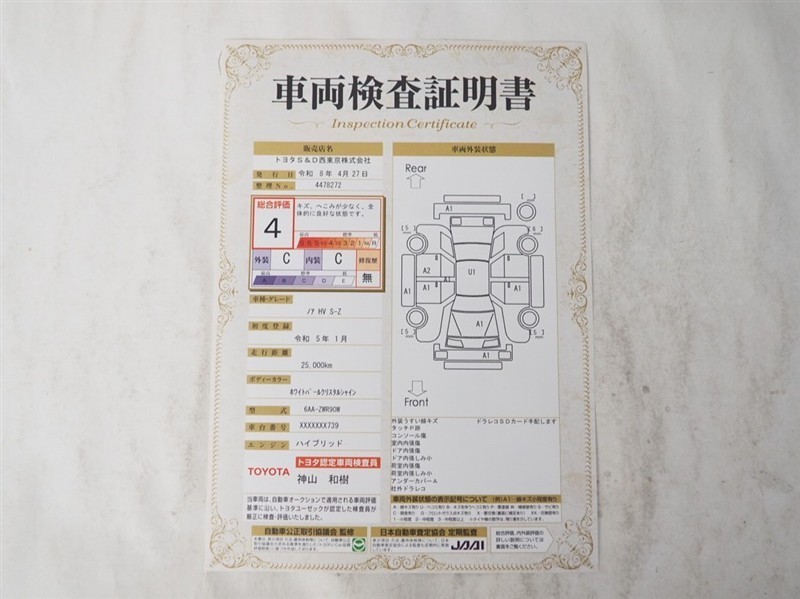 上記と同様の評価点・状態表を「車両検査証明書」として店舗の展示車両に搭載しております。
