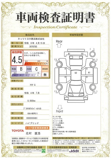 本ページに掲載された評価は、車両検査実施時の車両状態を示したものです。