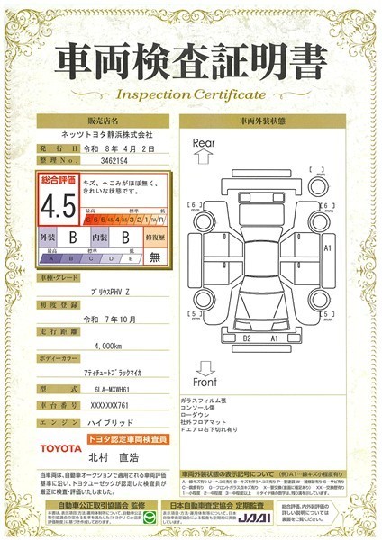 上記と同様の評価点・状態表を「車両検査証明書」として店舗の展示車両に搭載しております。