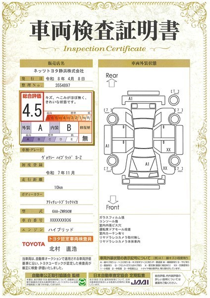 上記と同様の評価点・状態表を「車両検査証明書」として店舗の展示車両に搭載しております。