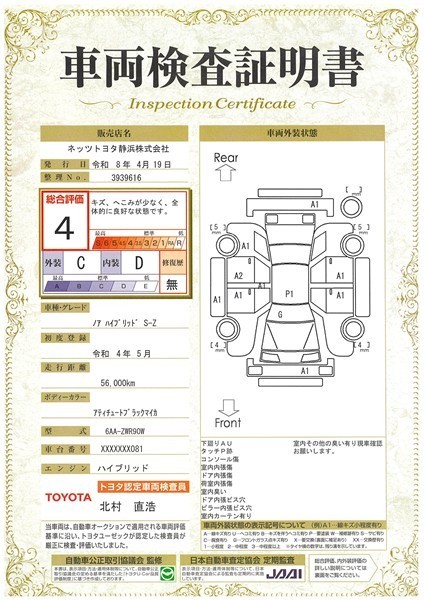 上記と同様の評価点・状態表を「車両検査証明書」として店舗の展示車両に搭載しております。