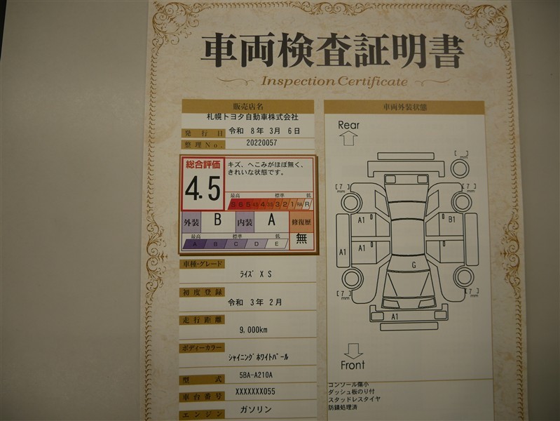 詳細及び現状の車両状態につきましては、店舗スタッフまでお尋ねください。 - 注2)上記と同様の評価点・状態表を「車両検査証明書」として店舗の展示車両に搭載しております。
