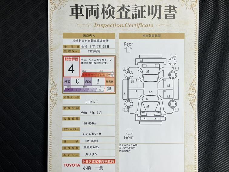 詳細及び現状の車両状態につきましては、店舗スタッフまでお尋ねください。 - 注2)上記と同様の評価点・状態表を「車両検査証明書」として店舗の展示車両に搭載しております。
