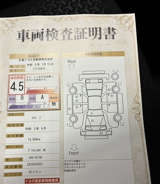 詳細及び現状の車両状態につきましては、店舗スタッフまでお尋ねください。 - 注2)上記と同様の評価点・状態表を「車両検査証明書」として店舗の展示車両に搭載しております。