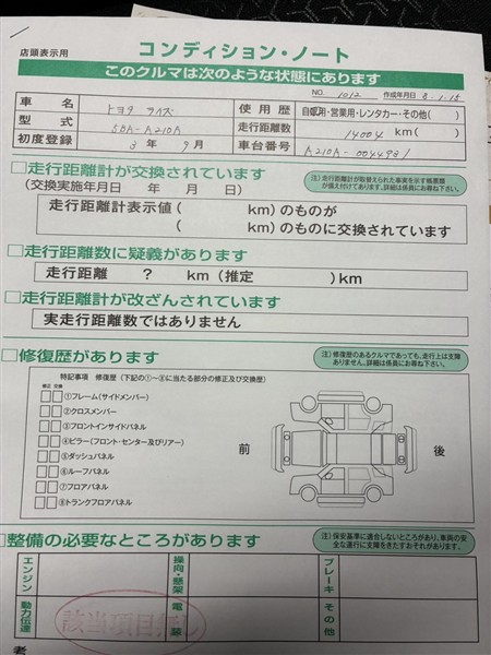 - 「修復歴あり」の場合、修復部位の詳細につきましては、販売店へお問合せください。