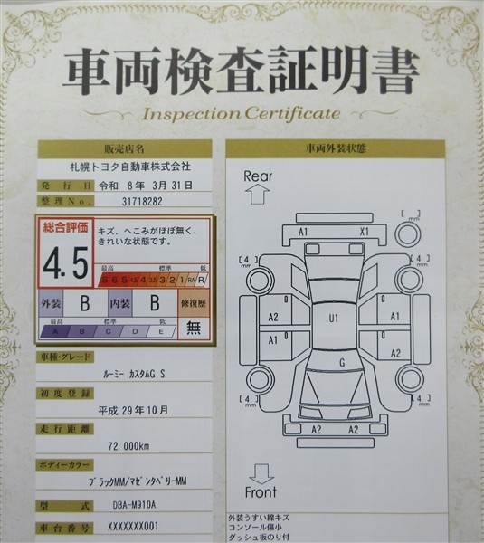 詳細及び現状の車両状態につきましては、店舗スタッフまでお尋ねください。 - 注2)上記と同様の評価点・状態表を「車両検査証明書」として店舗の展示車両に搭載しております。