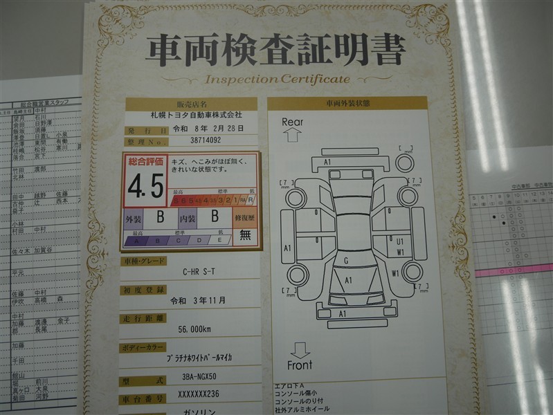 詳細及び現状の車両状態につきましては、店舗スタッフまでお尋ねください。 - 注2)上記と同様の評価点・状態表を「車両検査証明書」として店舗の展示車両に搭載しております。