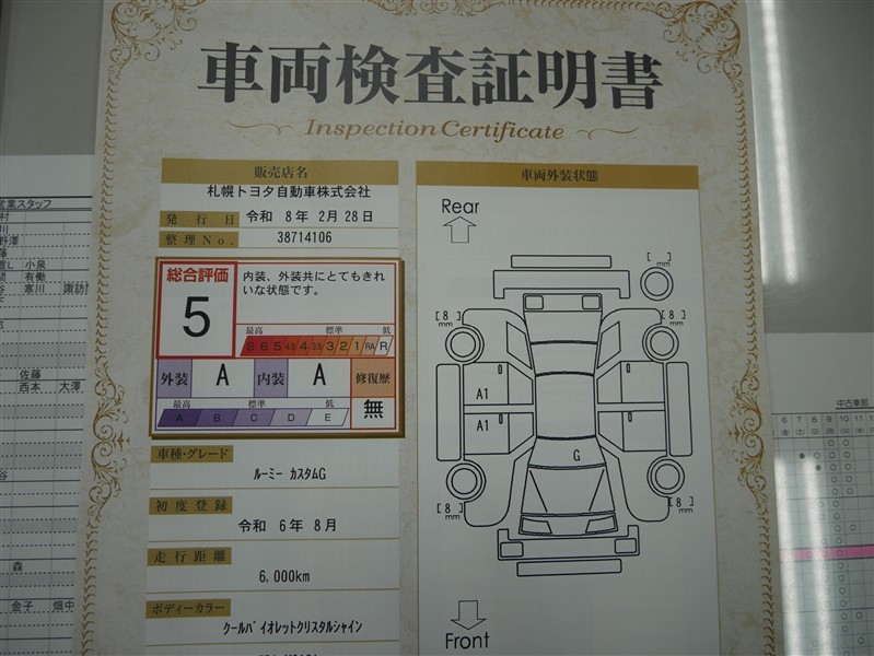 詳細及び現状の車両状態につきましては、店舗スタッフまでお尋ねください。 - 注2)上記と同様の評価点・状態表を「車両検査証明書」として店舗の展示車両に搭載しております。