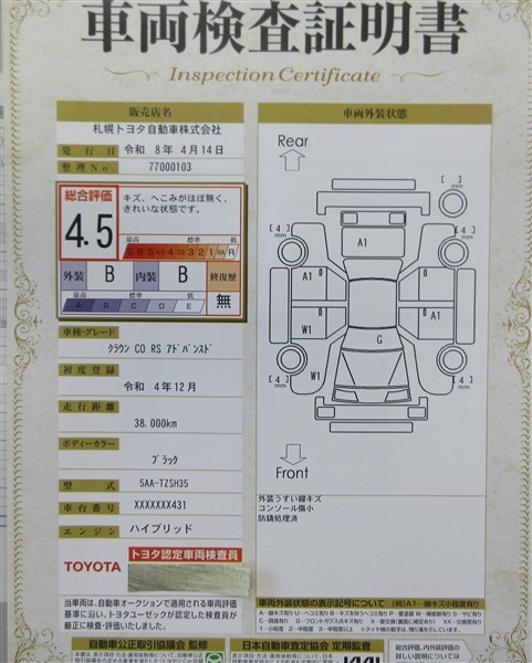 上記と同様の評価点・状態表を「車両検査証明書」として店舗の展示車両に搭載しております。