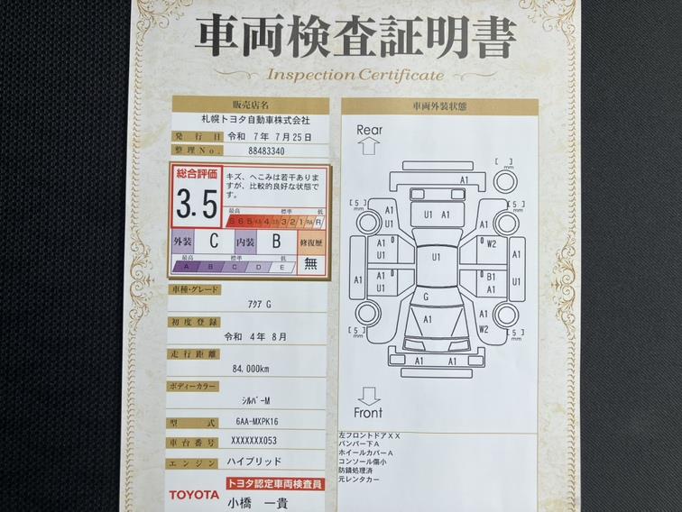 詳細及び現状の車両状態につきましては、店舗スタッフまでお尋ねください。 - 注2)上記と同様の評価点・状態表を「車両検査証明書」として店舗の展示車両に搭載しております。