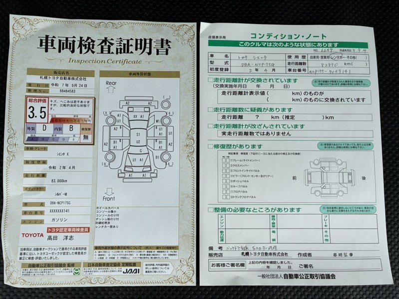 詳細及び現状の車両状態につきましては、店舗スタッフまでお尋ねください。 - 注2)上記と同様の評価点・状態表を「車両検査証明書」として店舗の展示車両に搭載しております。