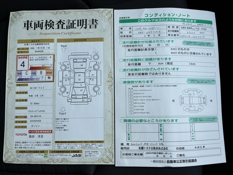 詳細及び現状の車両状態につきましては、店舗スタッフまでお尋ねください。 - 注2)上記と同様の評価点・状態表を「車両検査証明書」として店舗の展示車両に搭載しております。