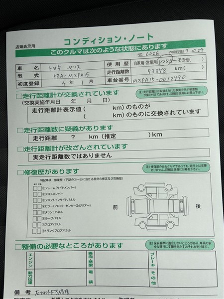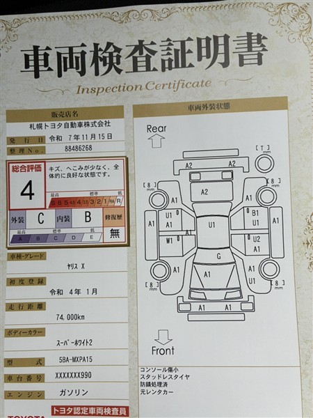 詳細及び現状の車両状態につきましては、店舗スタッフまでお尋ねください。 - 注2)上記と同様の評価点・状態表を「車両検査証明書」として店舗の展示車両に搭載しております。