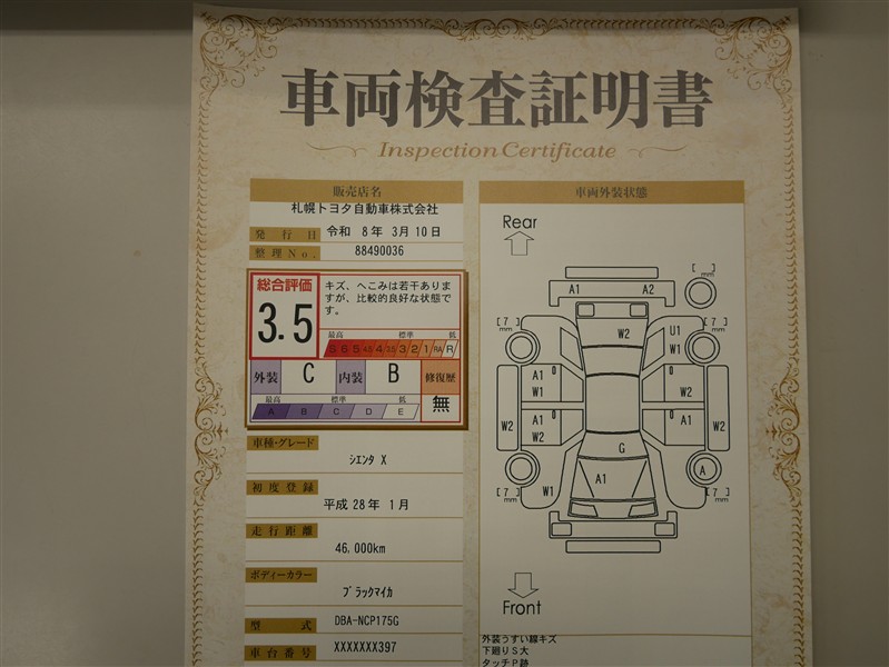 詳細及び現状の車両状態につきましては、店舗スタッフまでお尋ねください。 - 注2)上記と同様の評価点・状態表を「車両検査証明書」として店舗の展示車両に搭載しております。