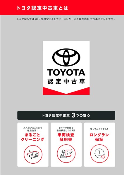 - 表示項目・方法・運用体制等について、自動車公正取引協議会の定める基準を満たした「トヨタU-Car品質評価制度」に基づき作成しております。