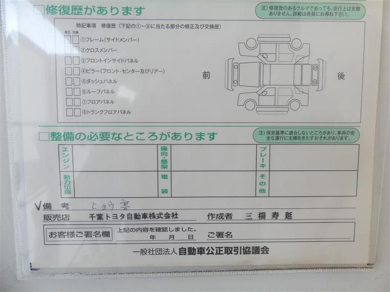 詳細及び現状の車両状態につきましては、店舗スタッフまでお尋ねください。 - 注2)上記と同様の評価点・状態表を「車両検査証明書」として店舗の展示車両に搭載しております。