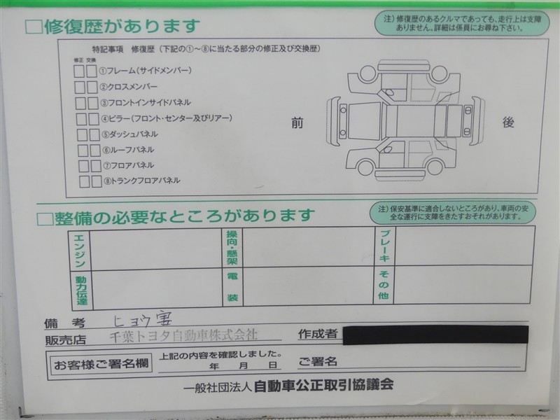 - 「定期点検整備なし(要整備箇所あり)」の場合、整備箇所につきましては、販売店へお問合せください。