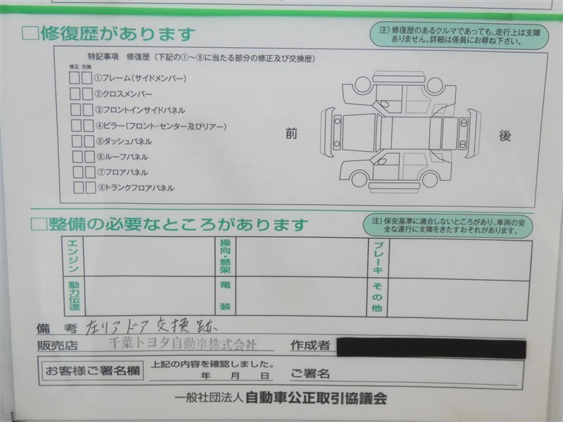 詳細及び現状の車両状態につきましては、店舗スタッフまでお尋ねください。 - 注2)上記と同様の評価点・状態表を「車両検査証明書」として店舗の展示車両に搭載しております。