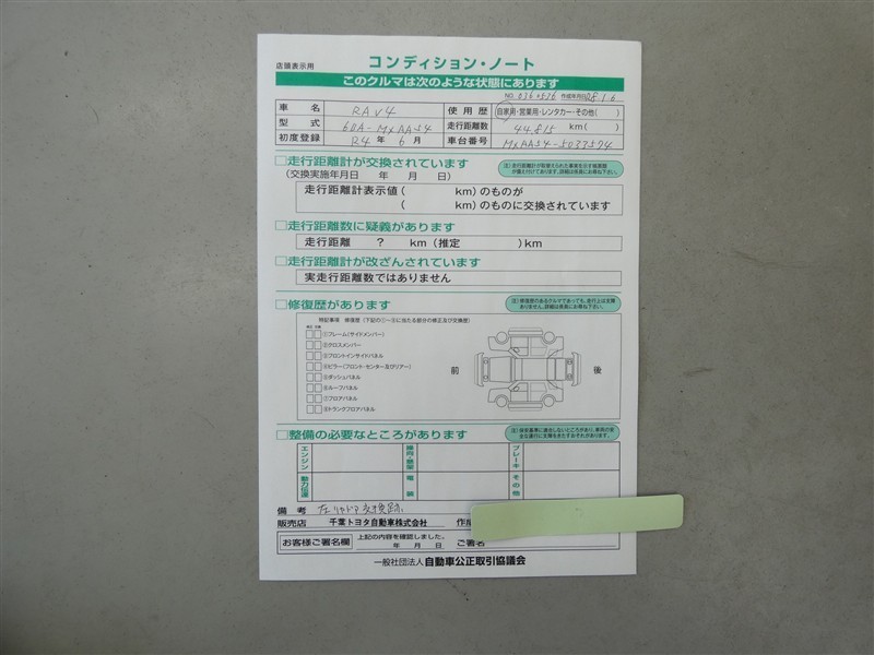 詳細及び現状の車両状態につきましては、店舗スタッフまでお尋ねください。 - 注2)上記と同様の評価点・状態表を「車両検査証明書」として店舗の展示車両に搭載しております。