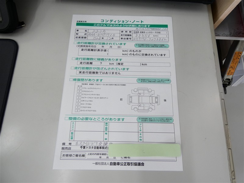 詳細及び現状の車両状態につきましては、店舗スタッフまでお尋ねください。 - 注2)上記と同様の評価点・状態表を「車両検査証明書」として店舗の展示車両に搭載しております。