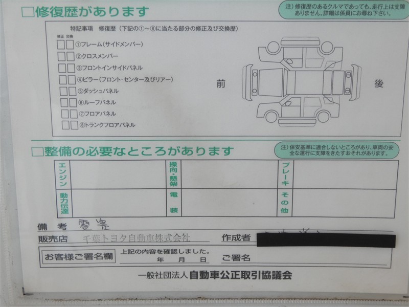 - 「定期点検整備なし(要整備箇所あり)」の場合、整備箇所につきましては、販売店へお問合せください。