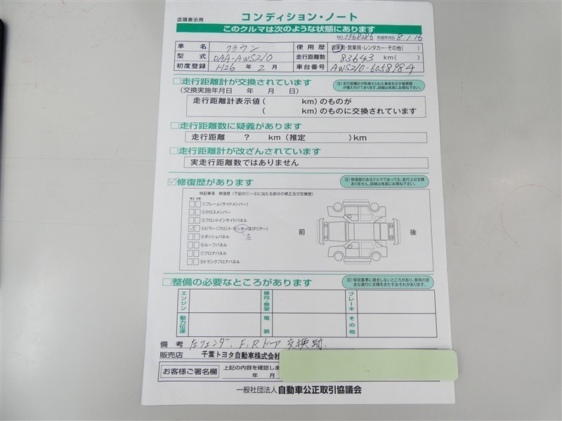- 「修復歴あり」の場合、修復部位の詳細につきましては、販売店へお問合せください。