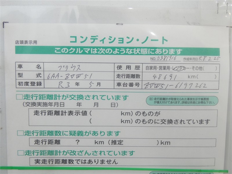 詳細及び現状の車両状態につきましては、店舗スタッフまでお尋ねください。 - 注2)上記と同様の評価点・状態表を「車両検査証明書」として店舗の展示車両に搭載しております。
