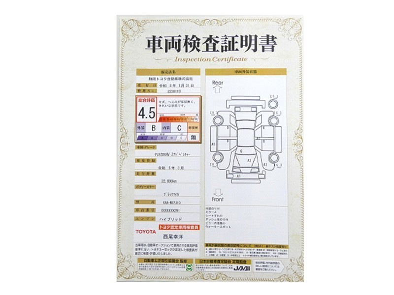 詳細及び現状の車両状態につきましては、店舗スタッフまでお尋ねください。 - 注2)上記と同様の評価点・状態表を「車両検査証明書」として店舗の展示車両に搭載しております。