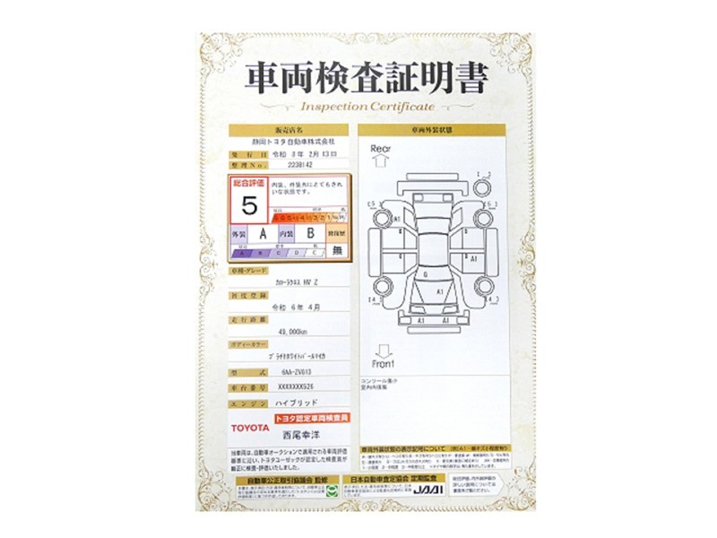 詳細及び現状の車両状態につきましては、店舗スタッフまでお尋ねください。 - 注2)上記と同様の評価点・状態表を「車両検査証明書」として店舗の展示車両に搭載しております。