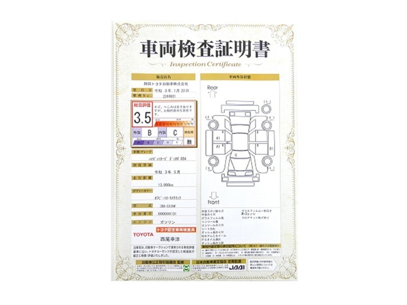 詳細及び現状の車両状態につきましては、店舗スタッフまでお尋ねください。 - 注2)上記と同様の評価点・状態表を「車両検査証明書」として店舗の展示車両に搭載しております。