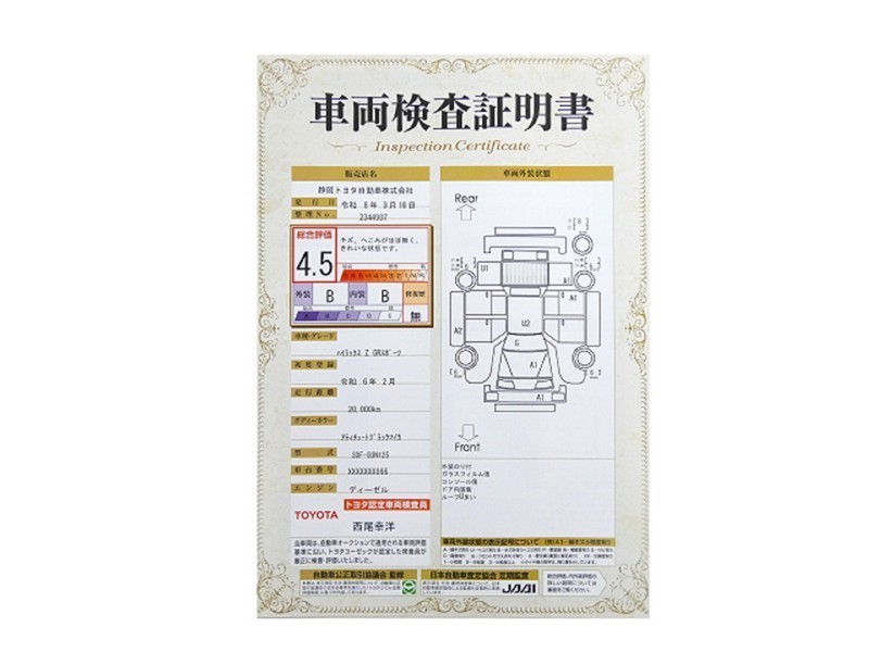 詳細及び現状の車両状態につきましては、店舗スタッフまでお尋ねください。 - 注2)上記と同様の評価点・状態表を「車両検査証明書」として店舗の展示車両に搭載しております。