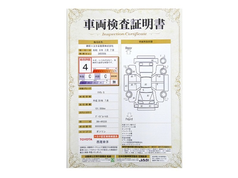 詳細及び現状の車両状態につきましては、店舗スタッフまでお尋ねください。 - 注2)上記と同様の評価点・状態表を「車両検査証明書」として店舗の展示車両に搭載しております。