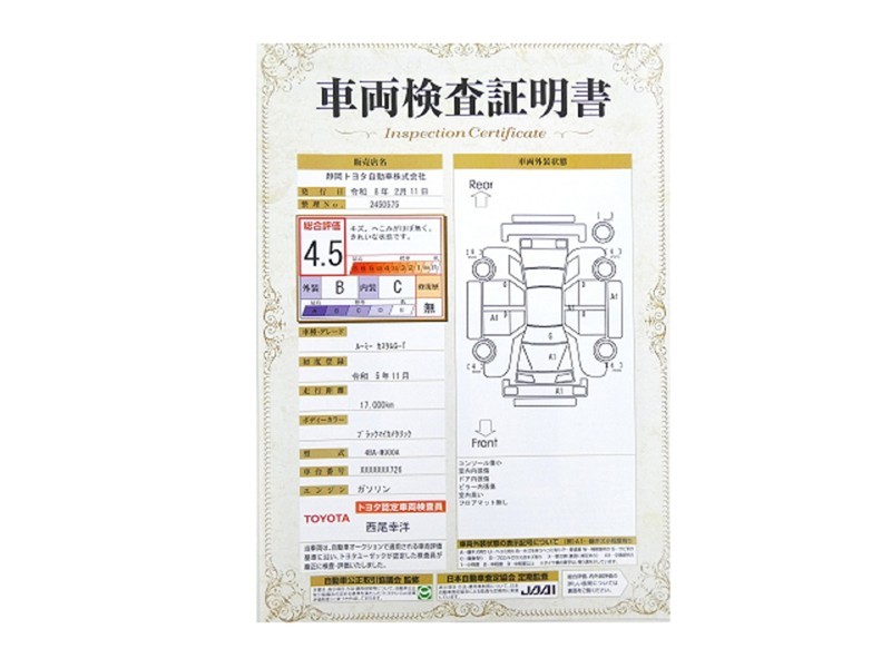 詳細及び現状の車両状態につきましては、店舗スタッフまでお尋ねください。 - 注2)上記と同様の評価点・状態表を「車両検査証明書」として店舗の展示車両に搭載しております。