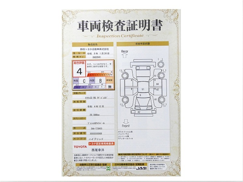 詳細及び現状の車両状態につきましては、店舗スタッフまでお尋ねください。 - 注2)上記と同様の評価点・状態表を「車両検査証明書」として店舗の展示車両に搭載しております。
