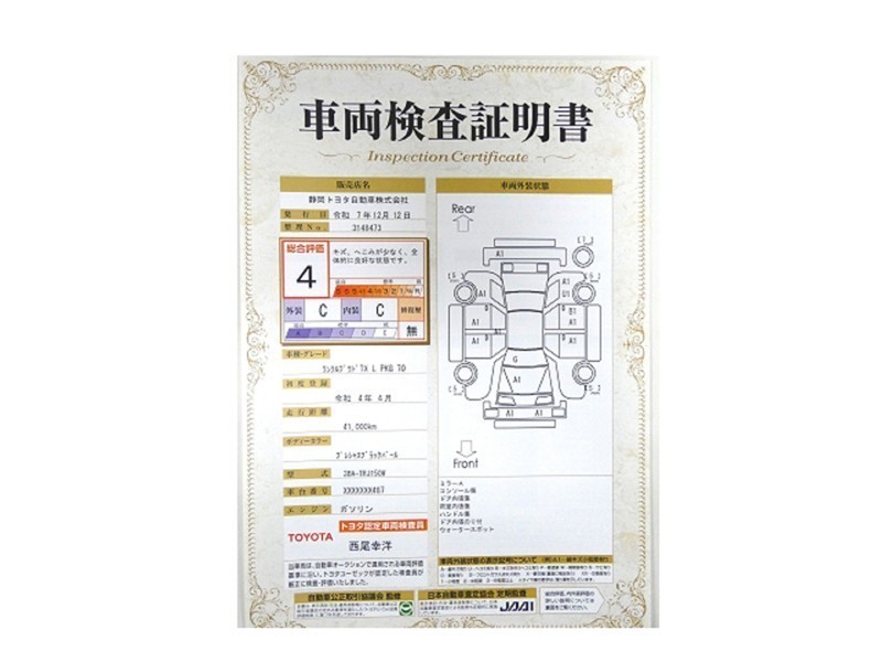 詳細及び現状の車両状態につきましては、店舗スタッフまでお尋ねください。 - 注2)上記と同様の評価点・状態表を「車両検査証明書」として店舗の展示車両に搭載しております。