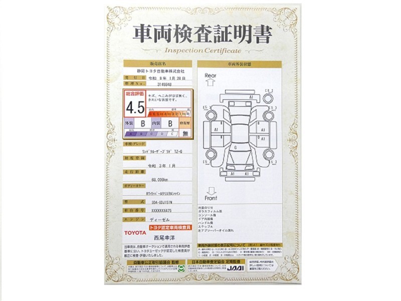 詳細及び現状の車両状態につきましては、店舗スタッフまでお尋ねください。 - 注2)上記と同様の評価点・状態表を「車両検査証明書」として店舗の展示車両に搭載しております。