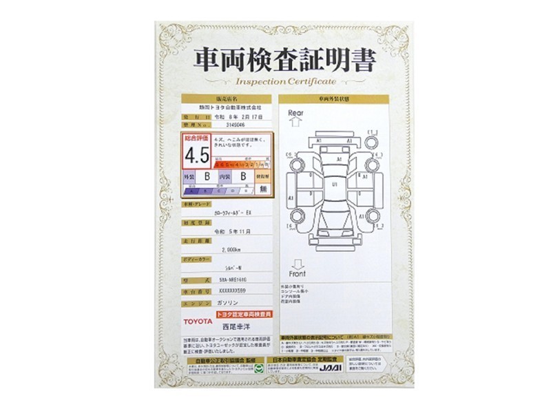 - 表示項目・方法・運用体制等について、自動車公正取引協議会の定める基準を満たした「トヨタU-Car品質評価制度」に基づき作成しております。