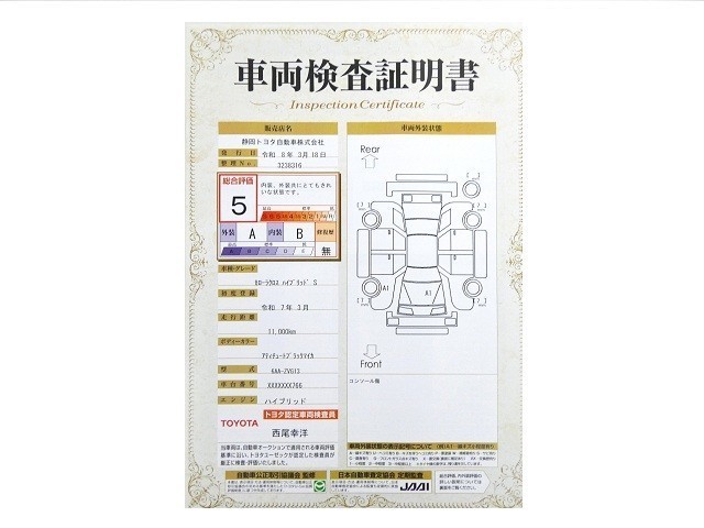 詳細及び現状の車両状態につきましては、店舗スタッフまでお尋ねください。 - 注2)上記と同様の評価点・状態表を「車両検査証明書」として店舗の展示車両に搭載しております。