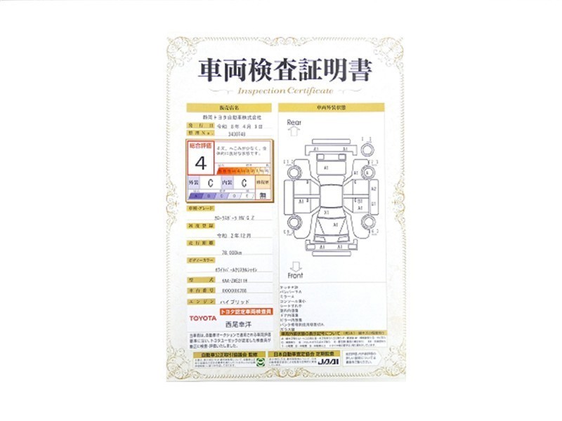 詳細及び現状の車両状態につきましては、店舗スタッフまでお尋ねください。 - 注2)上記と同様の評価点・状態表を「車両検査証明書」として店舗の展示車両に搭載しております。