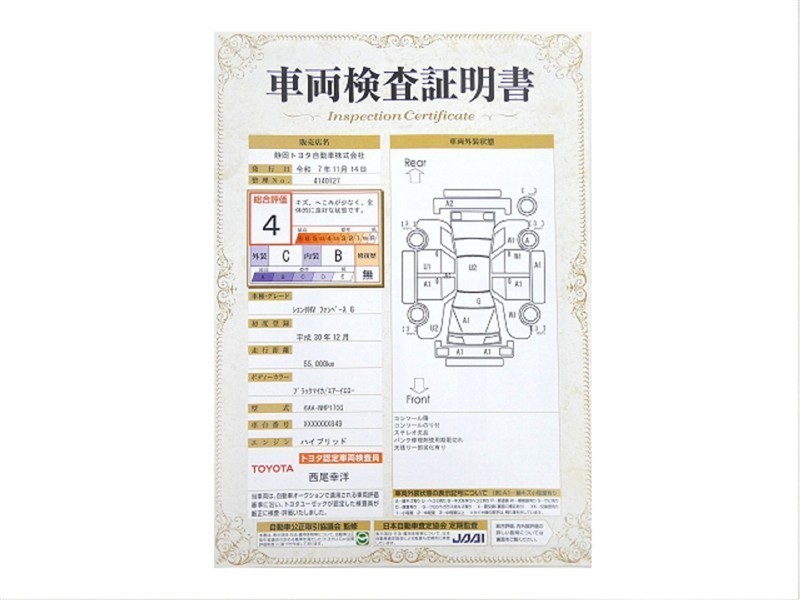 詳細及び現状の車両状態につきましては、店舗スタッフまでお尋ねください。 - 注2)上記と同様の評価点・状態表を「車両検査証明書」として店舗の展示車両に搭載しております。