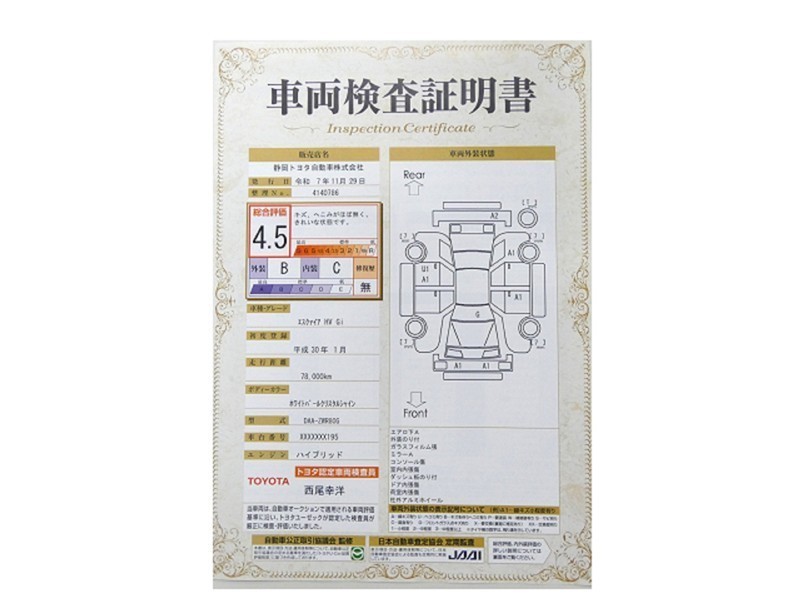 詳細及び現状の車両状態につきましては、店舗スタッフまでお尋ねください。 - 注2)上記と同様の評価点・状態表を「車両検査証明書」として店舗の展示車両に搭載しております。
