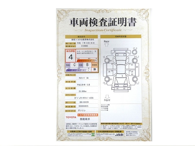 詳細及び現状の車両状態につきましては、店舗スタッフまでお尋ねください。 - 注2)上記と同様の評価点・状態表を「車両検査証明書」として店舗の展示車両に搭載しております。
